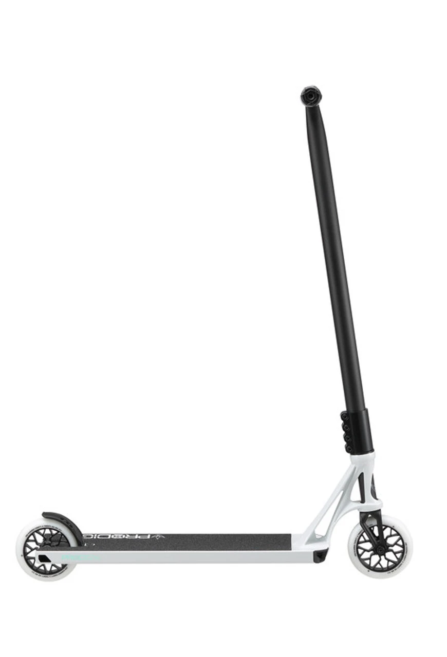 The heart of the scooter is our deck, for the Series X we developed a brand NEW deck extrusion – The Extech extrusion. This extrusion has a stealth lower profile, wider internal walls, boxier construction featuring a high responsive concave. The PX Headtube has been redesigned as well, increasing contact with the deck, a diamond cutout and streamlined profile. The PX Street deck now comes with new dimensions 5.5” W x 21” L and our updated Aluminum Box Ends. The box ends maintain the boxier construction all the way to the end of the deck- perfect for smoother 5-0 grinds. All these features combine to reduce the overall weight and maintain strength. Stacked on top of the new deck we have some upgraded parts. Grip tape with increased grit count for additional grip and durability. V2 Nylon brake system adjusted to fit with our Extech extrusion. The STREET complete is stacked with street styled parts- Fully Butted T bars, these chromoly bars have varied internal wall thickness’ Thick were it needs to be strong and thinner where it doesn’t. This maintains the strength of the Steel though reduces the weight dramatically. Essential 4 Bolt SCS- A streamlined version of our aftermarket OMEN SCS clamp. LOW stack headset compression cap, redesigned to integrate and streamline perfectly with our SCS clamp compression system. All rolling on the SECTOR 120mm x 26mm PU wheels 86A with the increased PU width assist with core protection and smoother ride. The complete scooter comes in at a weight of 3.585kg/7.9lbs making it one of the lightest street completes. The Prodigy legacy continues to grow and can always be relied on for quality and performance.