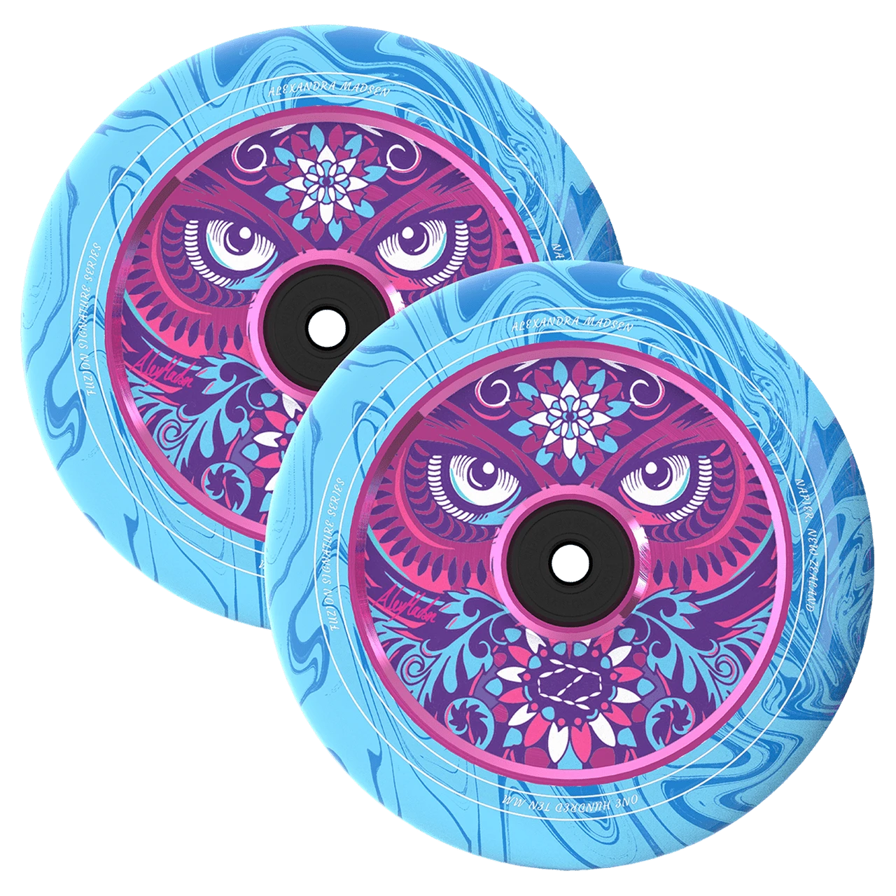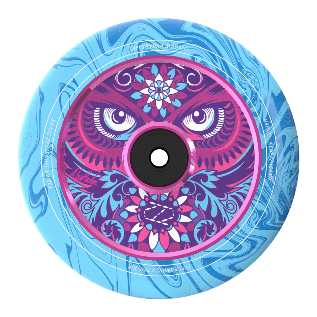 Alexandra Madsen’s signature wheels are insane. Anodized Pink Core with graphics that match her favorite tattoo and a 2 tone blue swirl PU. Alexandra’s wheel is one of the coolest sig wheels ever made. Its a bold statement but we stand by it.