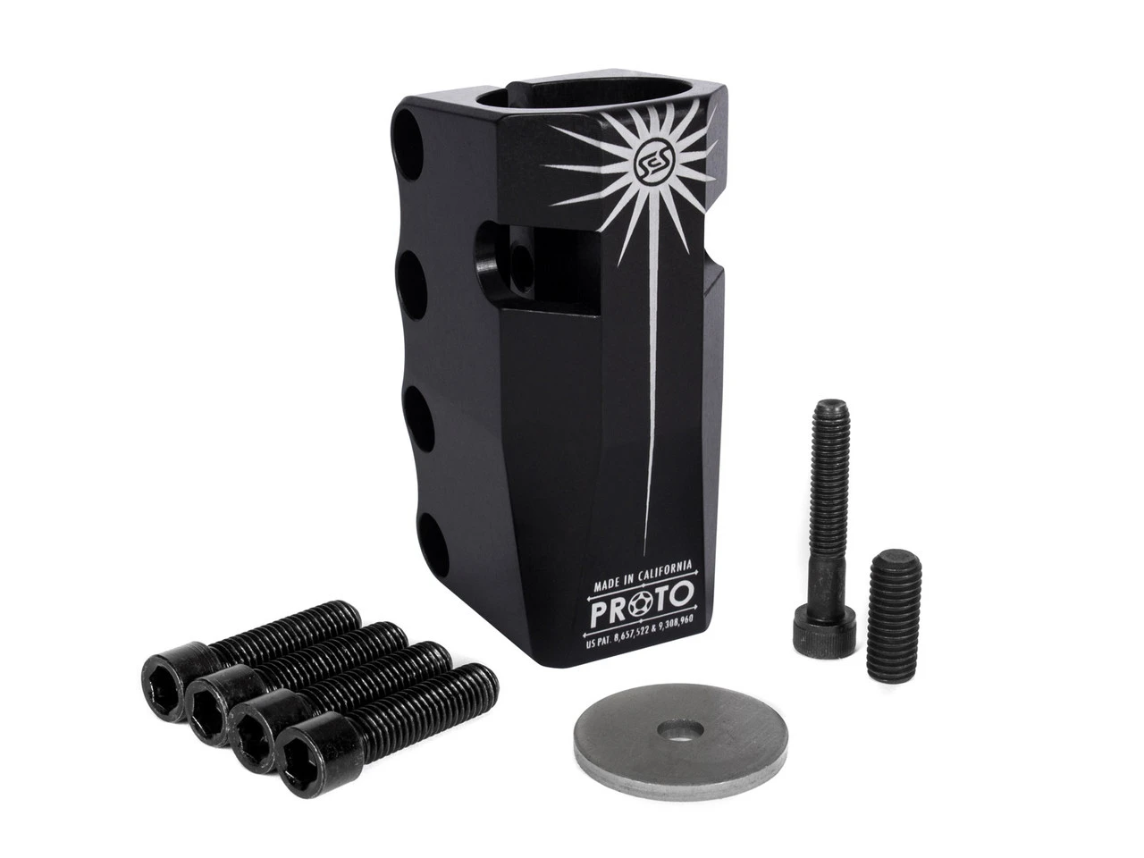 Eight years after inventing the world’s first and best Standard Compression System™ (SCS™), PROTO is proud to introduce the next generation of SCS™. The Sentinel SCS™ is the most technically advanced Standard Compression System™ ever created. Coming in at 3.5″ tall, it offers a full 2″ of handlebar support to accommodate the taller bars we are seeing become more prominent which is over 30% more support than a 3″ SCS™. It also features larger 8mm bolts with 6mm allen drives and an offset slot providing 25% more threads for the new larger hardware to tighten into allowing for increased torque and decreased chance of stripping giving it the ability to stay tighter, longer than any other SCS™ on the market. To top it off, despite being half an inch taller, increased weight was not an issue with its tapered top and base and two cutouts that removed unnecessary material and weight. There is also a brand-new feature called the Spreader-Bolt which can be used opposite of the 4 main clamp bolts to open the clamp for easy installation and removal, totally eliminating the need for the “penny trick”. The SCS™ logo is placed symbolically as the “third-eye” of the Sentinel in the center of a crown of thorns representing enlightenment and salvation from the ways of the past and guarding the future of scooter design.